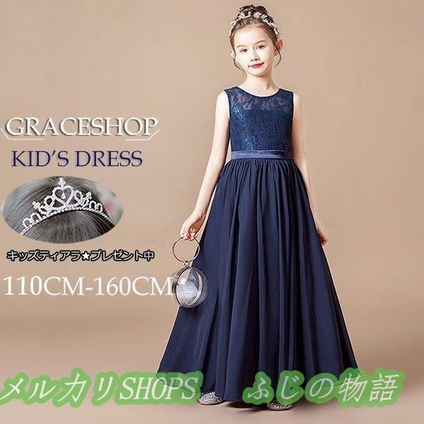 ピアノ発表会 ドレス 中学生 ネイビードレス キッズドレス シフォン レース ノースリーブ ロング丈 ファスナー ワンピース シンプル バイオリン147258