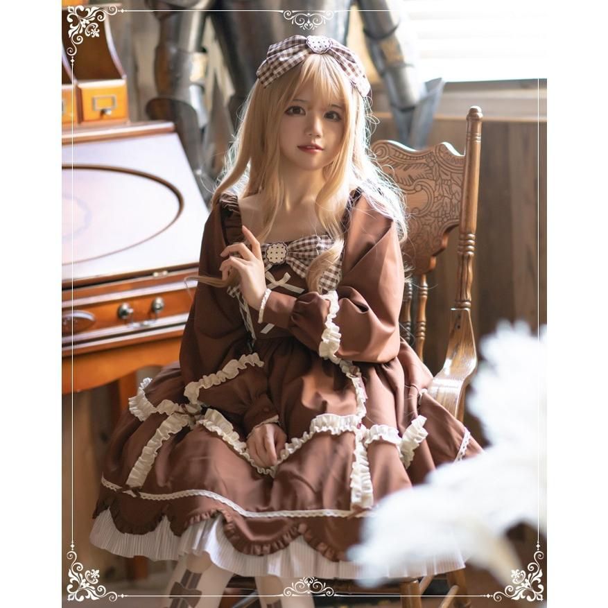 ワンピース ロリータ ドレス コスプレ衣装 茶色 長袖 レトロ 中世紀 宮殿風 貴族風 リボン フリル 森ガール レディース 女の子 少女 ゆめかわいい