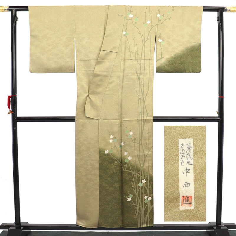 伝統工芸士中西進氏の訪問着。品のよい光沢のあるベージュに、渋めの金ですらりと伸びる梅の枝、一部刺繍を使い、梅の柄が表現された訪問着です。地色の薄い光沢が、程よい上品さを表現しております。薄緑と白の梅。裾には、茶深緑の深みのある色で、裾回りに重厚感があります。すっきりとした色使いで、シンプルながら使いですが、上品な美しい着姿をお楽しみいただけます。