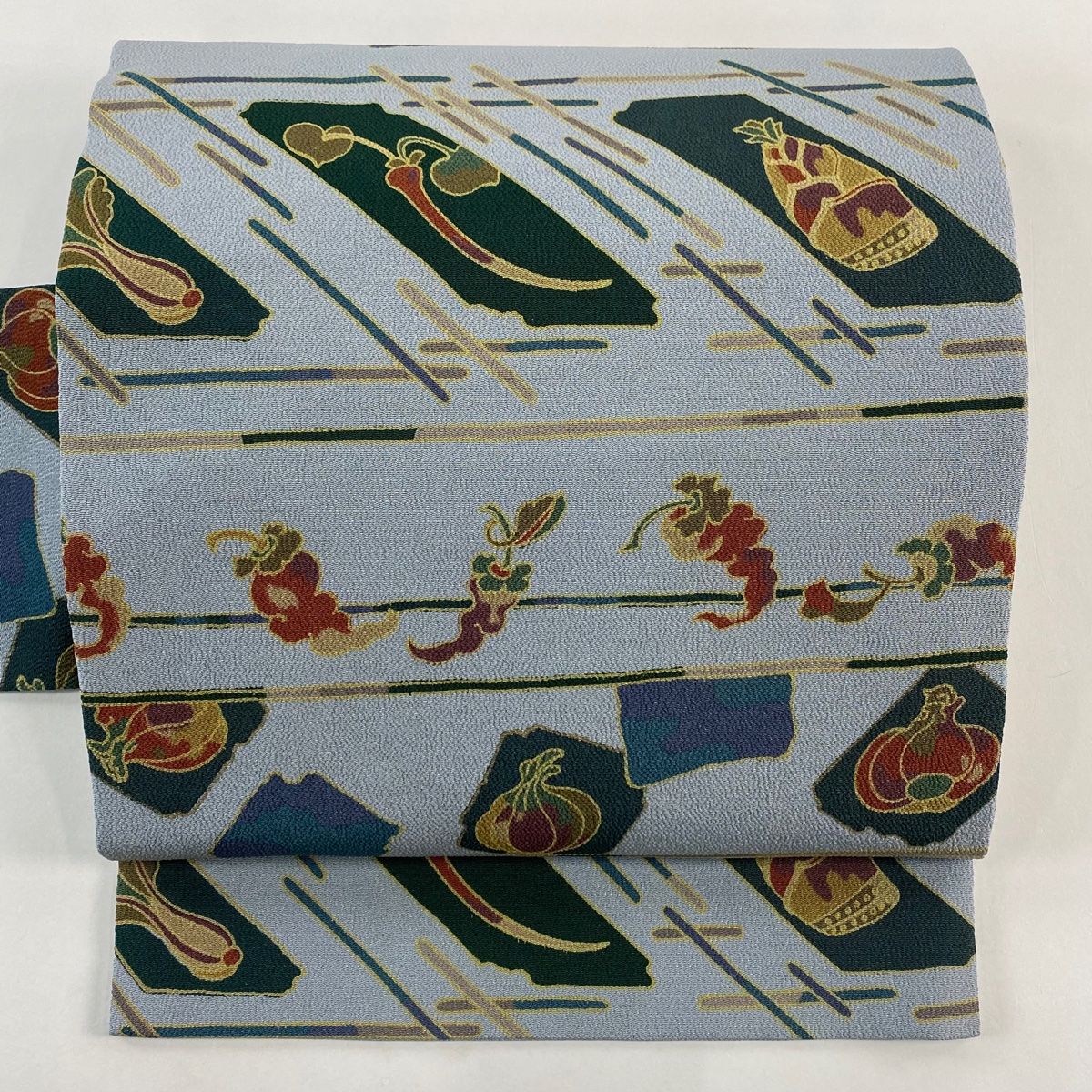 名古屋帯 秀品 野菜 幾何学 縮緬 青灰色 正絹