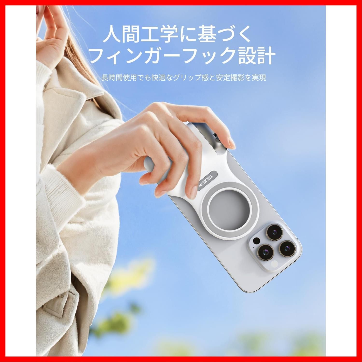 【人間工学デザインの快適グリップ】本製品には三脚は含まれていませんので、ご了承の上、ご購入ください。必要でしたらご自身でお買い求めください。長時間の撮影でも、手の疲れを忘れる。TELESINマグネットスマホグリップは手になじむ曲面デザインと滑り防止加工で、片手でも安定操作が可能。子供の運動会で追いかけながらでも、旅行中の風景撮影でも、ブレない映像と握り疲れゼロを実現。