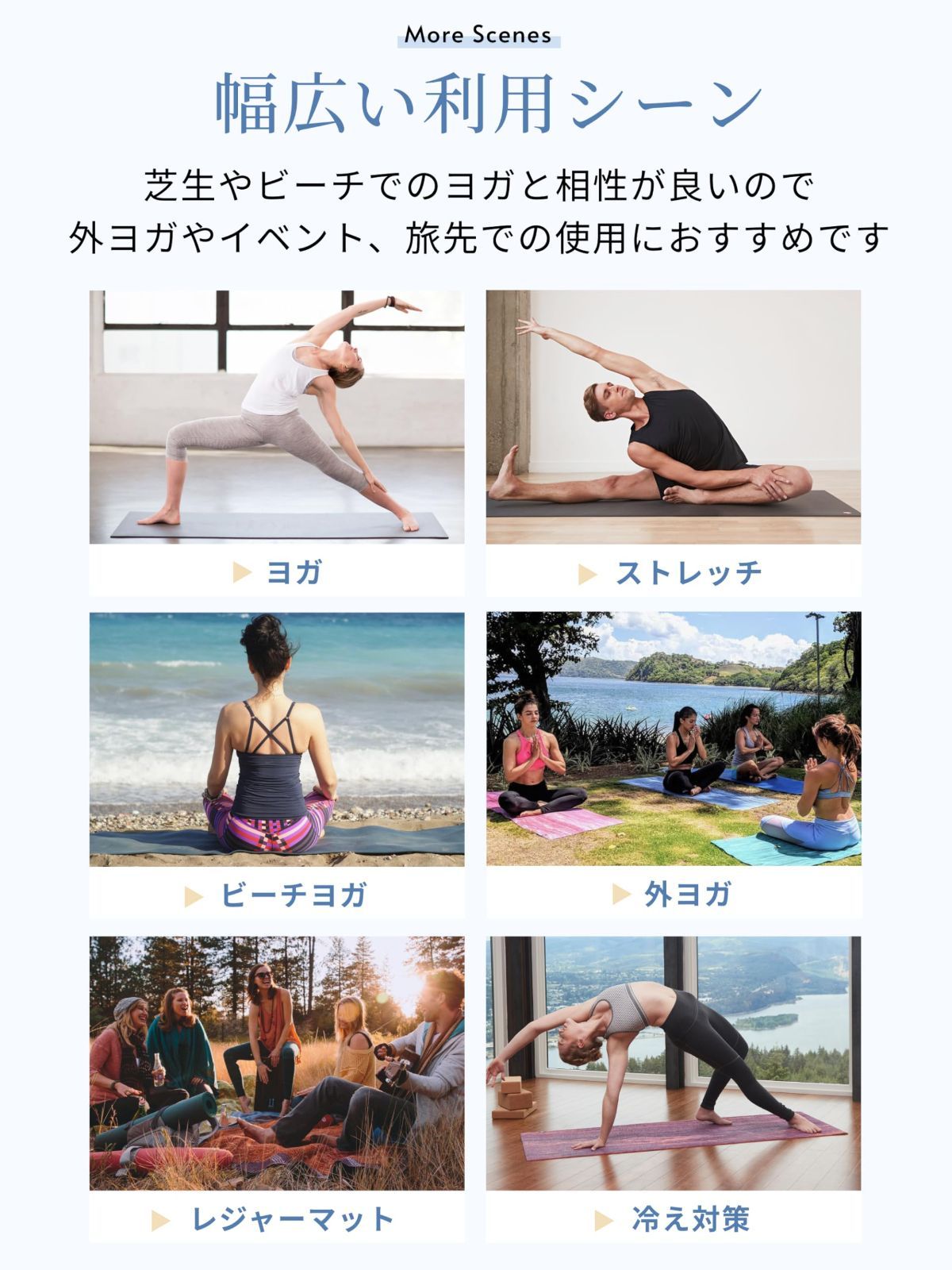 【“重ね使い”で衛生的に】スタジオやイベント時にはレンタルマットの上に重ねてクッション性アップ。グリップの低いヨガマットの上に敷けばしっかりとしたグリップを感じることができ、衛生面も安心。旅先やビーチではレジャーシートとしても使える。