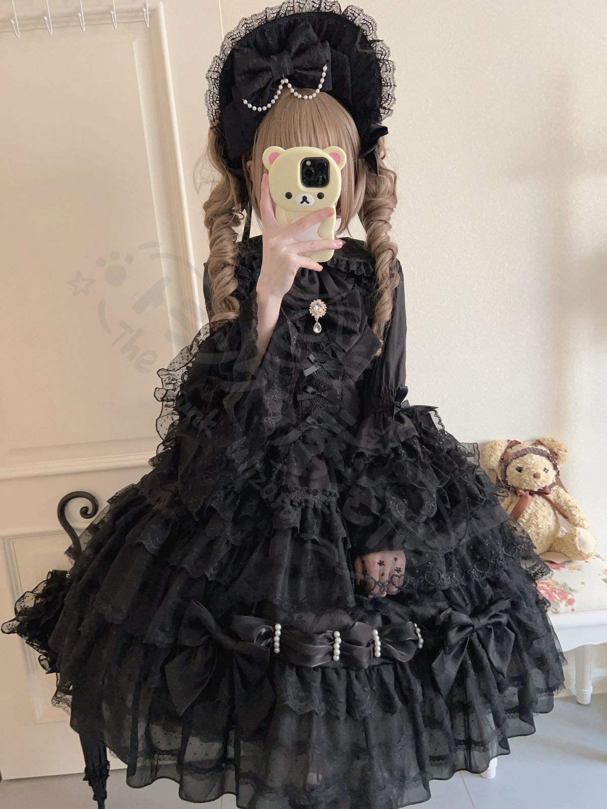 新年 用コスプレ衣装 冬ロリータドレJSK吊りスカー多層レース&リボン装ドール甘ロ豪華デザイ撮影会推し活イベントプレゼントにも最ブラック
