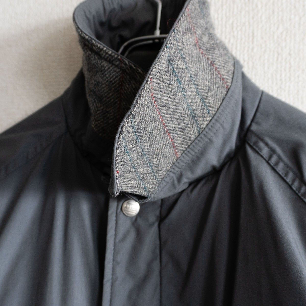 マウンテンパーカーのフードを無くしたようなデザインで、フロントはスナップとジップの比翼、ハンドポケット付き、襟裏や前を開けた時に見えるツイード地もこのアイテムの特徴です。
