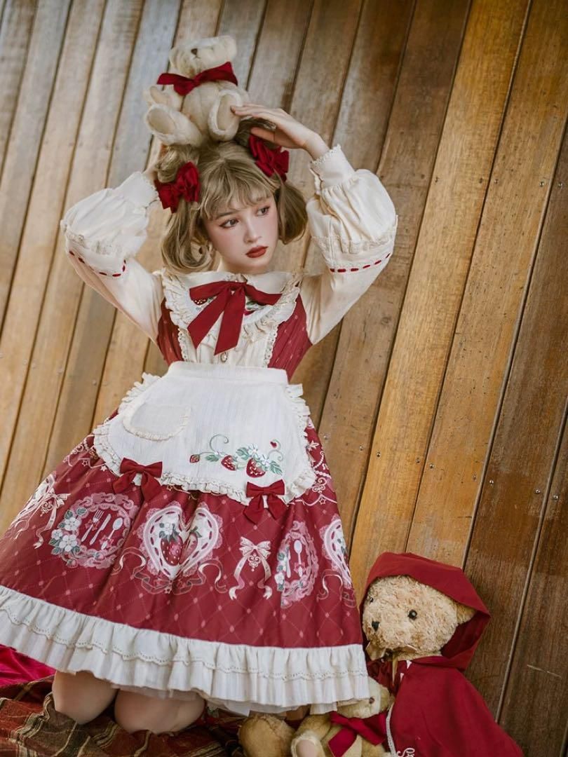 愛らしいいちご柄のひざ丈ワンピースとケープのセットで、春のお出かけや女子会にぴったり。ロリータファッションで普段の一日も特別なひとときに演出します。