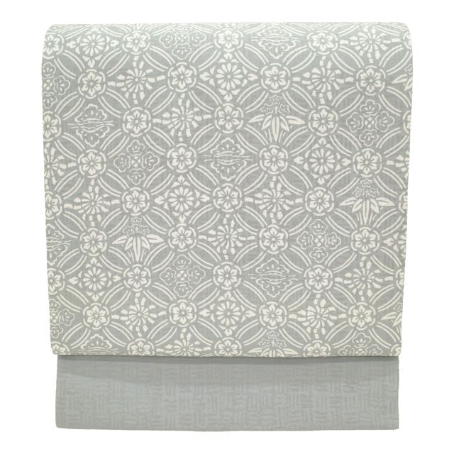 【新品】 名古屋帯 九寸 正絹 リサイクル 染め帯 手染め 型染 ライトグレー地 グレー系 七宝 松竹梅 花 極上 カジュアル 春 秋 冬 美品 仕立て上がり みやがわ sb54598