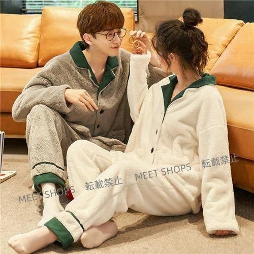 寝間着 秋冬ルームウェア パジャマ ペアルック お揃い レディース メンズ 暖かいナイトウェア ギフト プレゼント 前開き 上下セット 秋冬