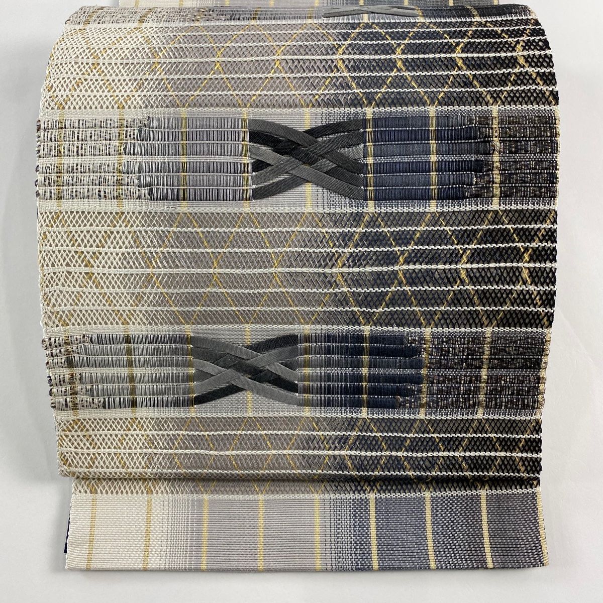 袋帯 秀品 縞 幾何学模様 金糸 刺繍 灰色 お太鼓柄 正絹