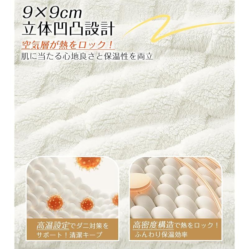 本製品は188×130cmの大型サイズで、全身をしっかり包み込む設計です。表面には9×9cmの立体凹凸模様が施された「水立方舒棉?」を採用。空気層を効果的に形成し、体温の逃げを防ぎます。さらに5層構造(立体綿?・織布・発熱線・織布・綿?)により、加熱なしでも厚みと保温性が持続。一般的な毛毯より約30%以上熱損失を抑制するため、暖房効率を上げながら電気代を節約できます。リビングでのくつろぎタイムや就寝時にも、冷え込みがちな足元から肩まで均一に温めます。