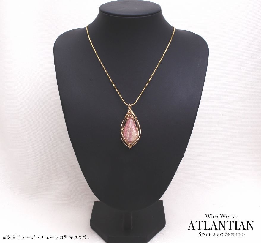 希少な北海道稲倉石鉱山産ロードクロサイトの原石をATLANTIANでカット研磨したルースをシンプルループのワイヤーワークで飾ったペンダントトップです。