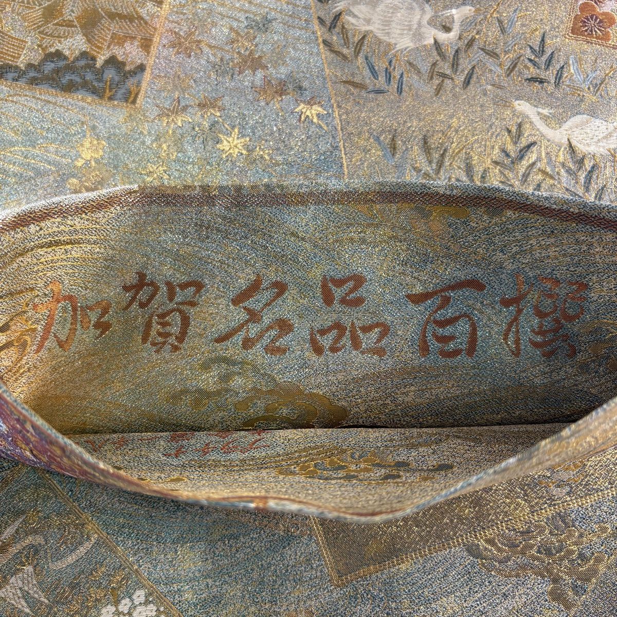 丸帯 加賀 百撰 色紙 枝梅 箔 水色 全通 正絹