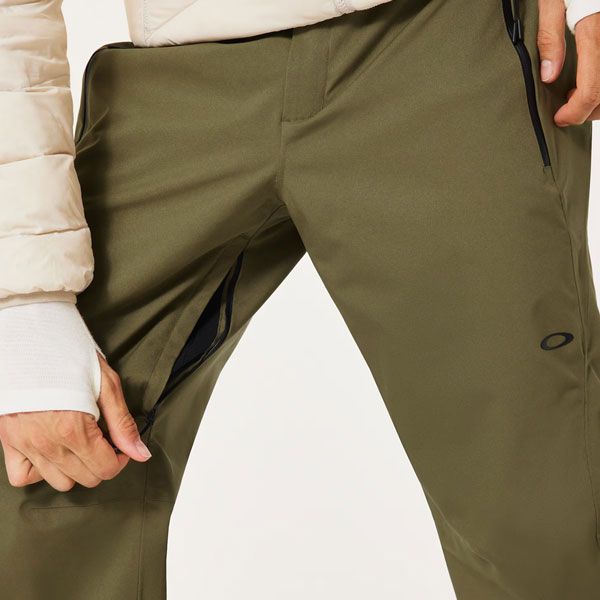 ファスナー付きの防水ハンドポケットは小物の収納に便利で、雪の侵入を防ぎます。内側の太もも部分にはメッシュライニング付きのベントを装備し、体温調節をサポート。