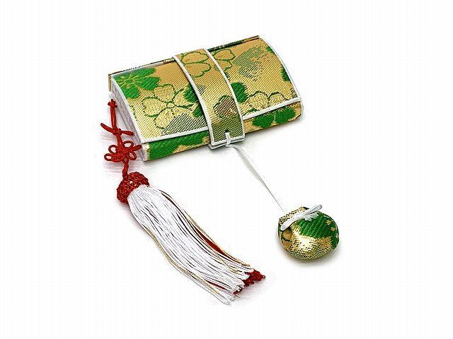 3歳 女の子用 結び帯 箱せこペアセット 金襴 作り帯 筥迫 はこせこ セット 小寸 金x緑 桜となでしこ UTPS-P 21 S