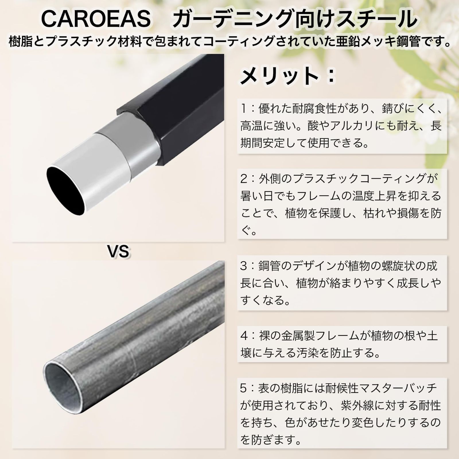 安定した構造---ローズアーバーは直径20mmの亜鉛メッキ パイプで作られており、非常に安定しており、表面は樹脂コーティングされているので、錆びにくく、耐候性があり、長期間安定して使用することができます。また、夏の植物の焼けを効果的に回避できます。ねじりパイプのため、植物が登るのが便利です。